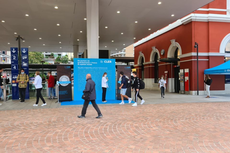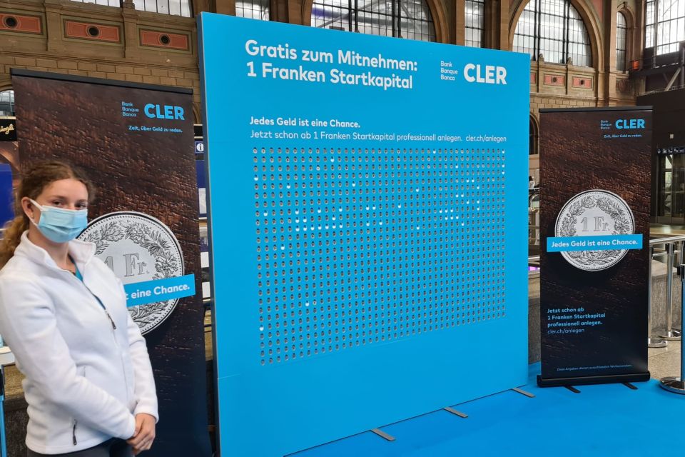 Mit einem Promotionsstand an verschiedenen Schweizer Bahnhöfen will man die hohe Frequenz an morgendlichen Pendlern nutzen, um auf das Anlageangebot der Bank Cler aufmerksam zu machen. Das Mittel zum Zweck ist eine eigens dafür produzierte Stellwand im Bank Cler Branding, welches mit 1'000 echten Einfranken-Stücken versehen ist. Promotorinnen und Promotoren laden die Passanten dazu ein, sich an der Wand zu bedienen und erklären dabei gleichzeitig die einfachen Anlagemöglichkeiten von welchen Bank Cler Kunden, und solche die es noch werden wollen, profitieren können. Um die Botschaft den Kunden mit auf den Weg zu geben, sind die Einfranken-Stücke zusätzlich mit einem QR-Code und dem Logo des Kunden beklebt.